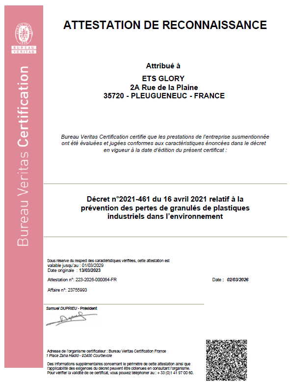 La société GLORY SAS et tous ses collaborateurs poursuivent leurs améliorations et leurs actions en faveur de la préservation de l’environnement tant sur notre site de production qu’auprès de nos partenaires et prestataires dans le cadre du Décret n°2021-461 du 16 avril 2021 relatif à la prévention des pertes de granulés de plastiques industriels dans l’environnement.